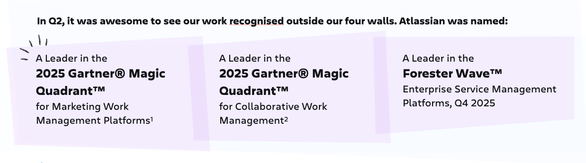 - Rovo sailed past 5 million MAU. Teamwork Graph now well past 100 billion+ objects & connections – our AI transformation continues to deliver for our customers’ workflows, with record agent & token use.