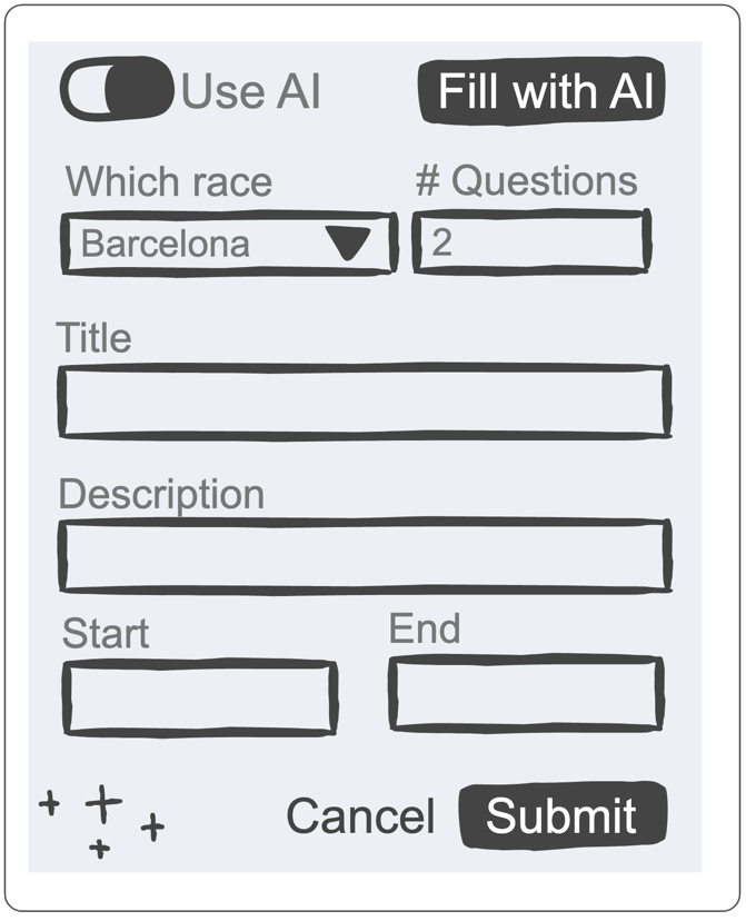 The actual form in the app has many more fields and takes quite a while to complete, so I added a feature to let AI help complete the form. The top of the form now has a toggle enabling the user to show the AI form-filling controls. These controls allow the user to specify some basic parameters to guide the AI in how to complete the form, and they are much quicker to complete than the main form.