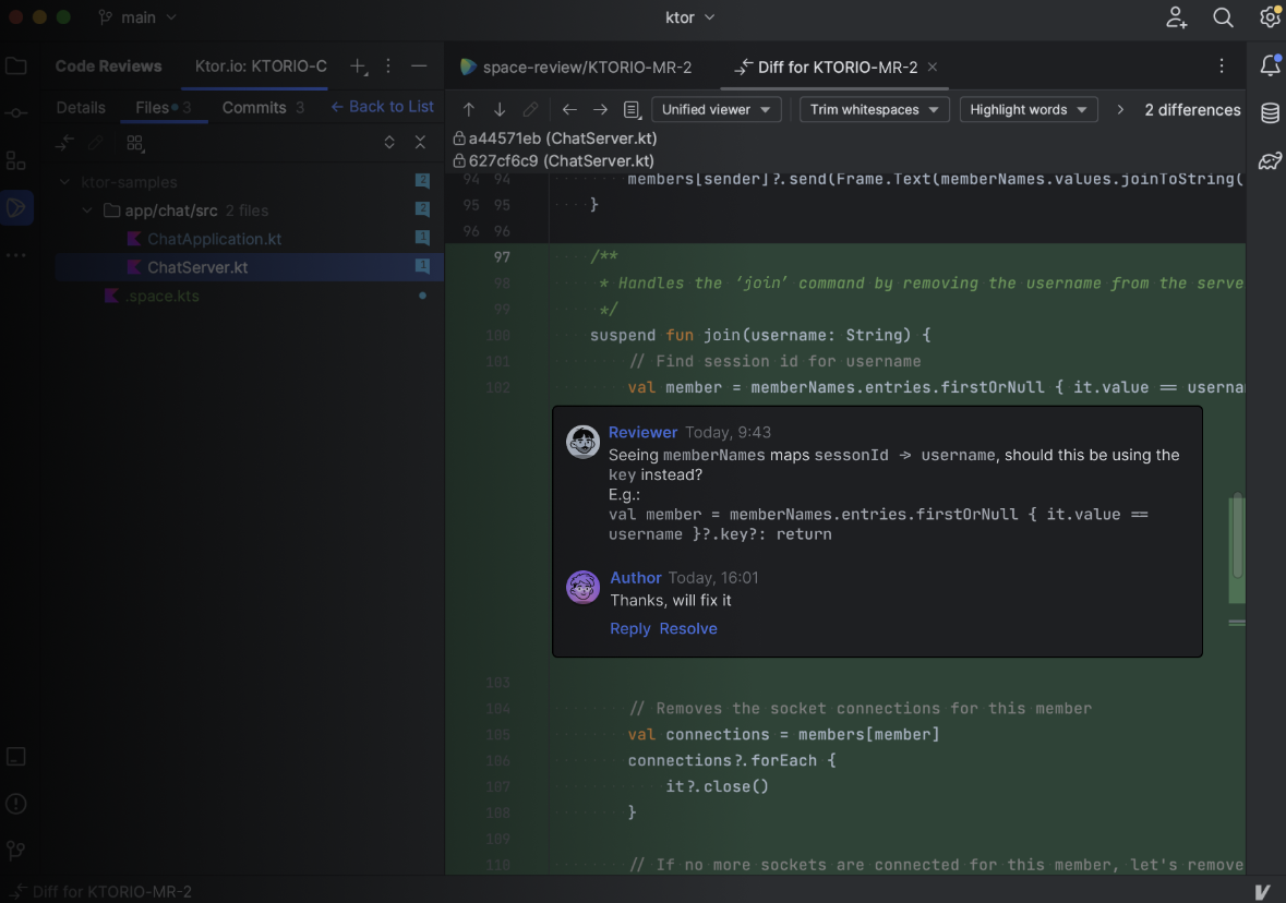- Automated assignments: Trust JetBrains Space to suggest and assign reviewers based on code ownership or file activity.