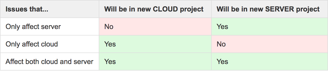 We have created new cloud and server projects and will copy existing issues from the JRA, JSD, JPO, JSW, and CONF projects as follows: