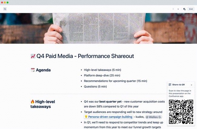 プレゼンターモード:ページをプレゼンターモードに切り替えると、サイドパネル、オプションメニュー、ページ内にあるインラインコメント等、プレゼンをするに当たって不要な情報は自動的に非表示になります。ページをスクロールしていくと、説明をしている箇所が強調され、その他の箇所が薄くなるので、物理的に離れた場所にいても、見てもらいたい箇所に視線をコントロールすることができます。カーソルの形状もポインターに変更され、特定の場所を指し示すこともできます。また、会議でプレゼンをすると、プレゼンしたページや情報へのリンクをメールやチャットで送って共有するという作業が伴うものですが、プレゼンターモードでは、該当ページへすぐにアクセスすることができるQRコードが表示されるため、別途リンクを送るという手間をかける必要がなくなります。
