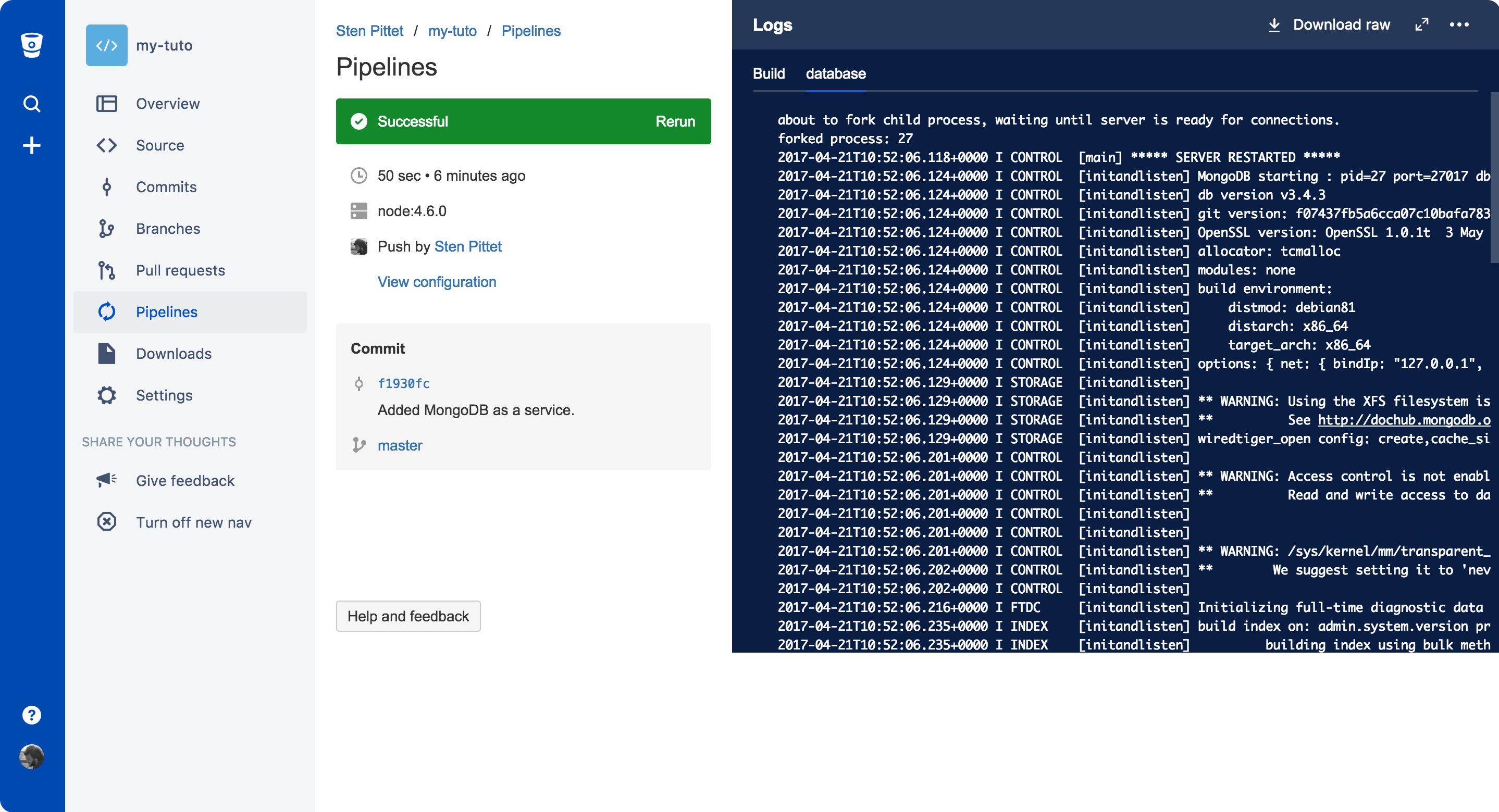 image: mongo Gehe nach dem Committen der Datei zu deinem Pipelines-Abschnitt, um die Pipeline in Bearbeitung zu sehen. Sie sollte normalerweise erfolgreich abgeschlossen werden.