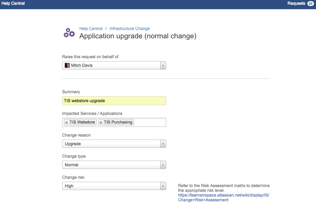 Raising a change request is easy by using the customer portal as a centralized place to raise all change requests. The customer portal is easy to find and documentation can be accessed from the request – for example, some teams provide Confluence links to change request processes (such as examples for classifying changes and determining risks). We also see a lot of customers using Confluence for creating detailed change planning pages for major system upgrades, which helps break down barriers across teams because they can collaborate around a central online document. These types of pages can then be referenced in the change request when it’s created.