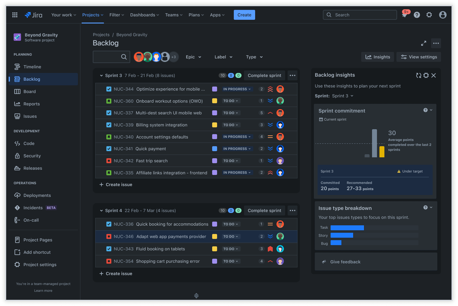 Jira にはフィボナッチ ストーリー ポイントに対する優れたサポートが組み込まれているため、追加のツールや複雑な設定なしでこの見積もりアプローチを簡単に実装できます。このプラットフォームには、ストーリー ポイントの見積もりとシームレスに連携するアジャイル プランニング ポーカー、ベロシティ追跡、スプリント計画の各機能が含まれています。