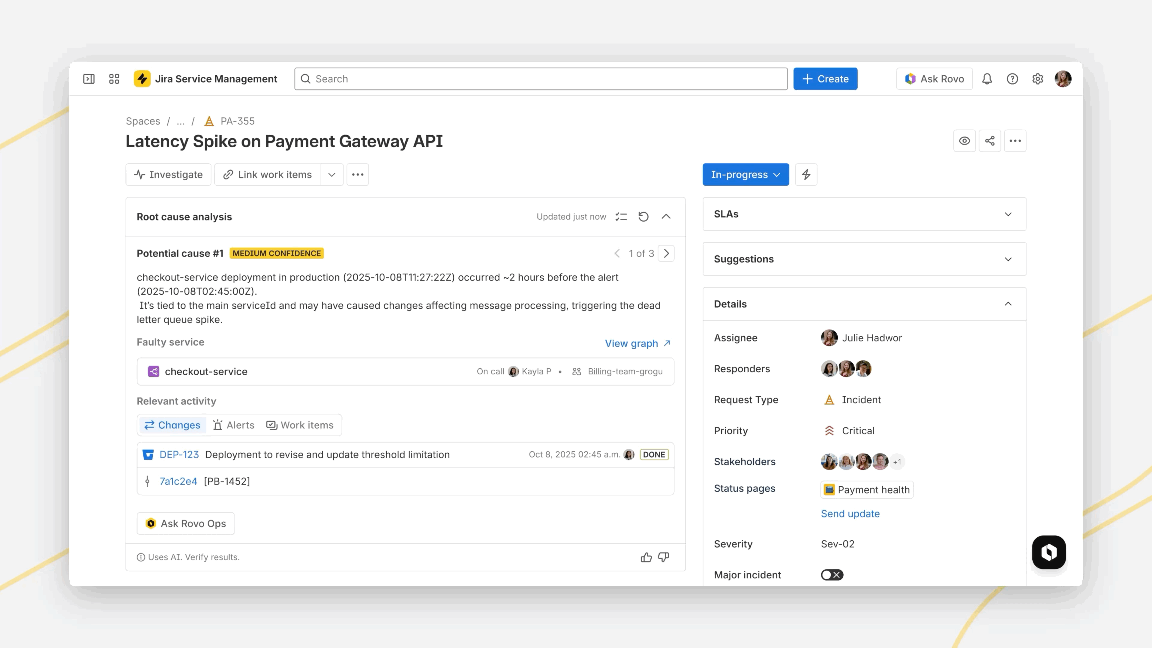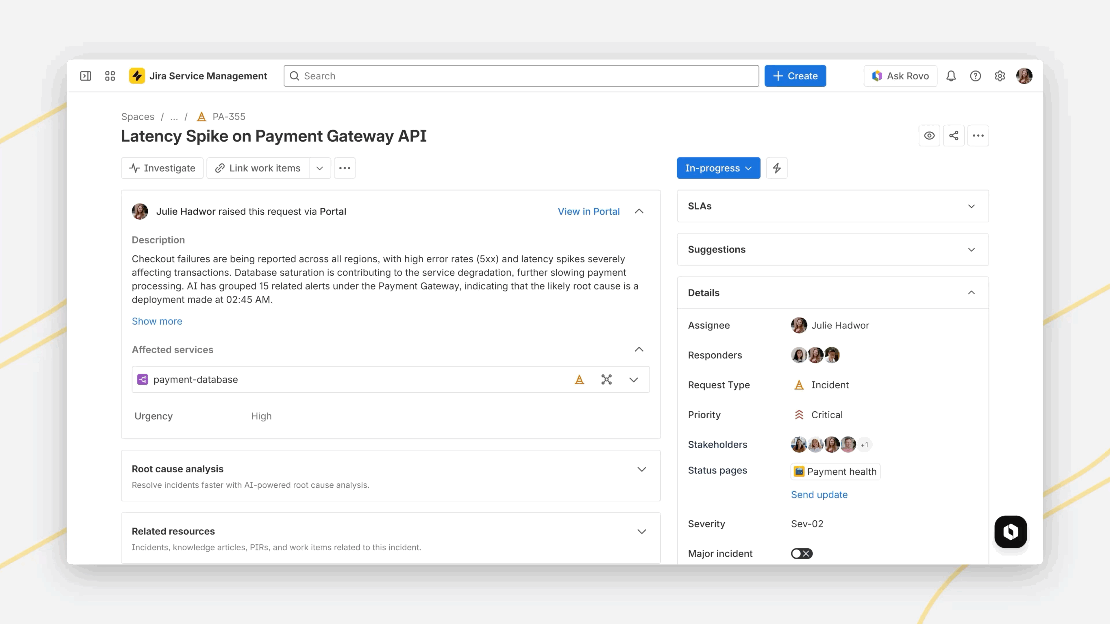 - AIによるスマートな復旧支援:Rovo Opsとの深い連携により、サードパーティの監視データを活用して根本原因を迅速に特定し、実行可能な手順を提供。インシデントのトリアージと優先順位付けにおける手動作業を削減しながら、チームの迅速な対応を可能にします。BigPanda連携により、インシデントはビジネスへの影響度に基づいて自動的に分類・優先順位付けされ、L1サポートチームは手動作業を減らしつつ迅速かつ正確に対応できます。