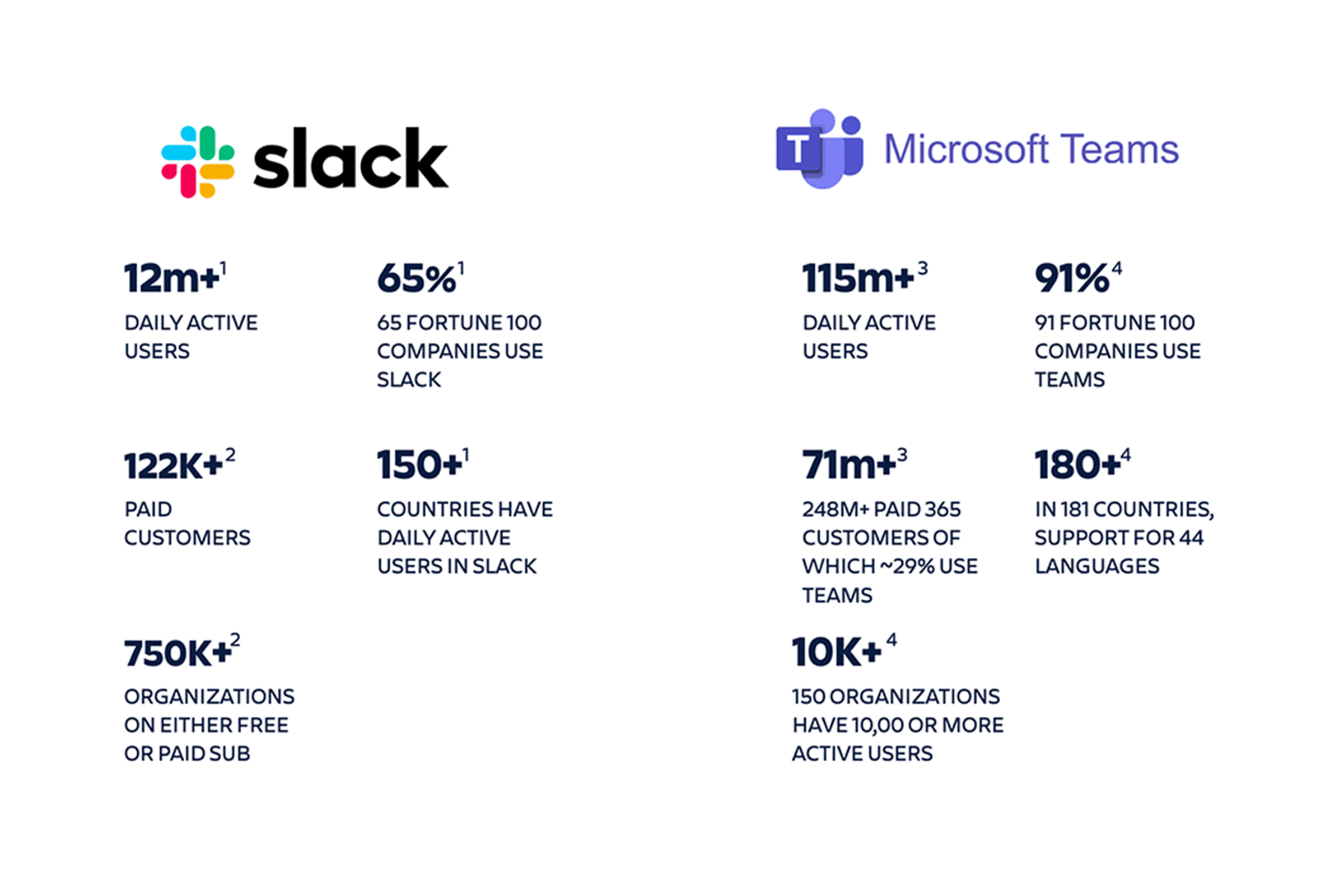 ご存知の通り、ビジネス チャット プラットフォームは急速に成長しています。フォーチュン 500 の企業の 65% が Slack を使用し、実に 91% が Microsoft Teams を使用しています。フォーチュン 500 以外でも、チャットには安定した人気があり、企業の 66% がSlack と Teams の両方を使用していると回答しています。また、今年はリモート ワークが急増したこともあり、Slack の顧客獲得数はほぼ倍増し、 第 1 四半期に 9,000 社の新規顧客 (四半期の平均は 5,000 社)を追加しています。