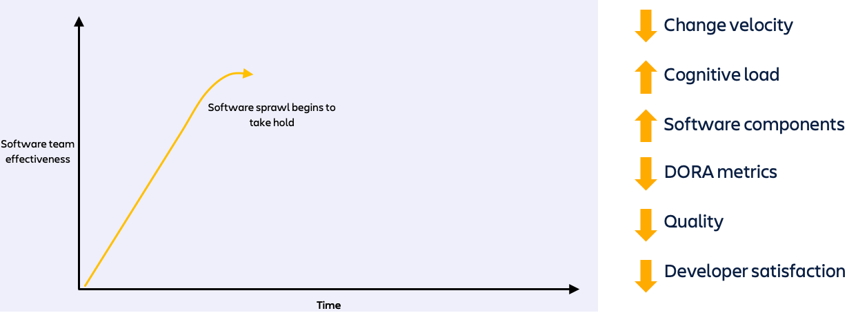 メリットを考慮して、より多くの組織がマイクロサービス アーキテクチャを導入し始め、自然と組織の複雑さが増え始めました。自律的なチームが増えるとより多くのコラボレーションが必要になり、マイクロサービスが増えると依存関係も増えます。変化のペースは急上昇しました。すべてソフトウェアのスプロール化の兆候です。複雑さが増すにつれて、変更ベロシティの低下が示すように、ソフトウェア チームの効率が横ばいになり、ソフトウェア チームにとって認知的負荷が課題になってきました。