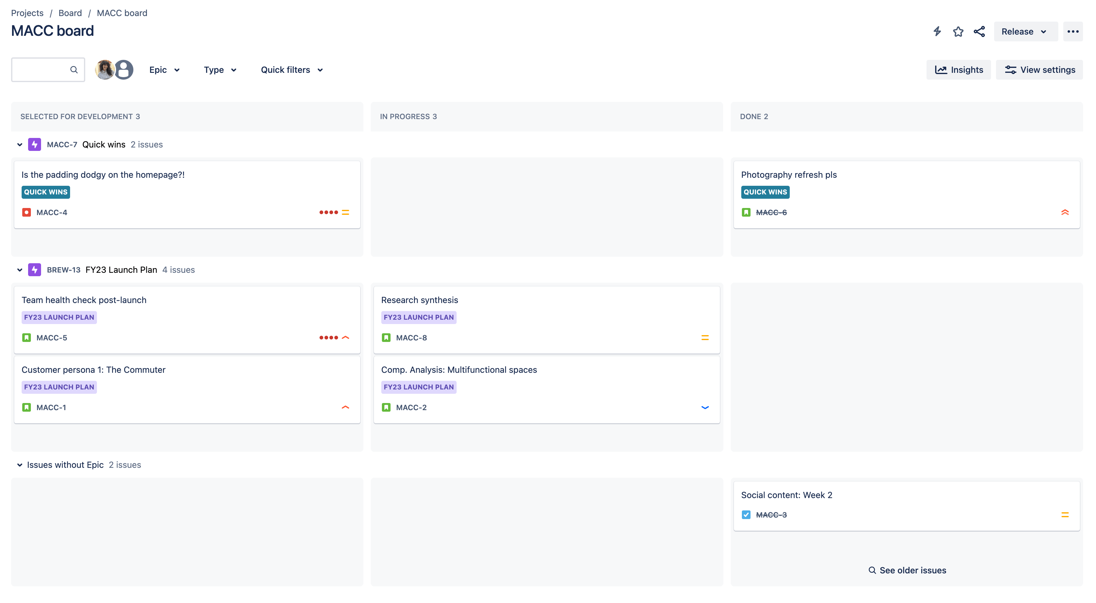 - セキュリティ上の理由。次のシナリオを考えてみましょう。Jira を使ってクライアントの作業をすべて管理しているコンサルティング チームが、透明性を高めるためにクライアントに Jira アクセスを提供したいと考えています。チームは単一のプロジェクトでクライアントのすべての作業を管理することもできますが、各クライアントに特定の権限を付与したプロジェクト横断型ボードを作成すれば、情報セキュリティを確保できます。