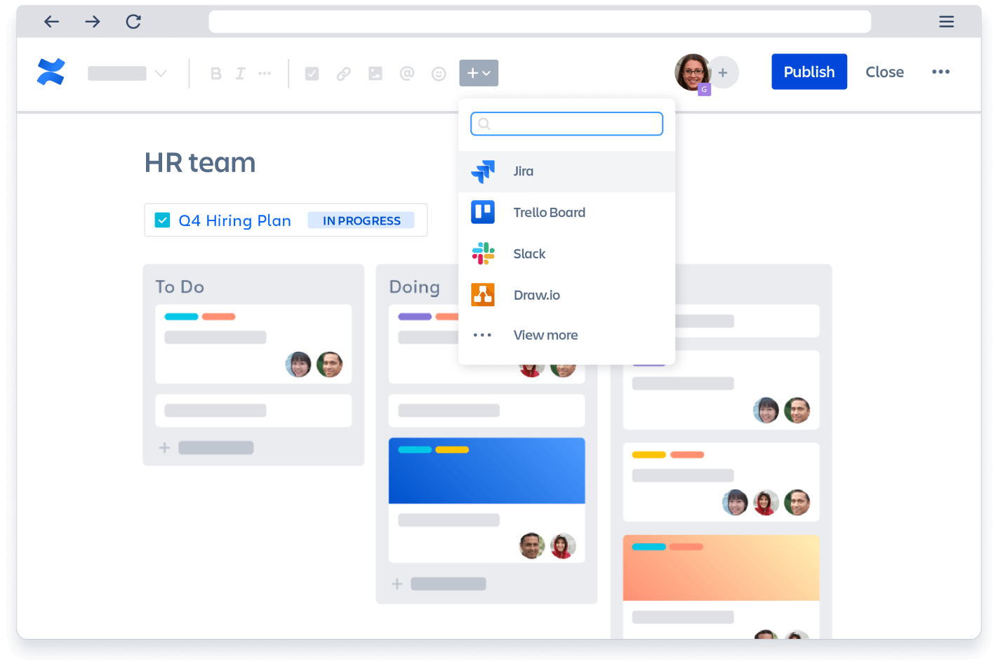 - 유여한 Confluence 페이지에서 프로젝트를 계획하고, 메모하고, 타사 앱의 참조 자료를 포함합니다