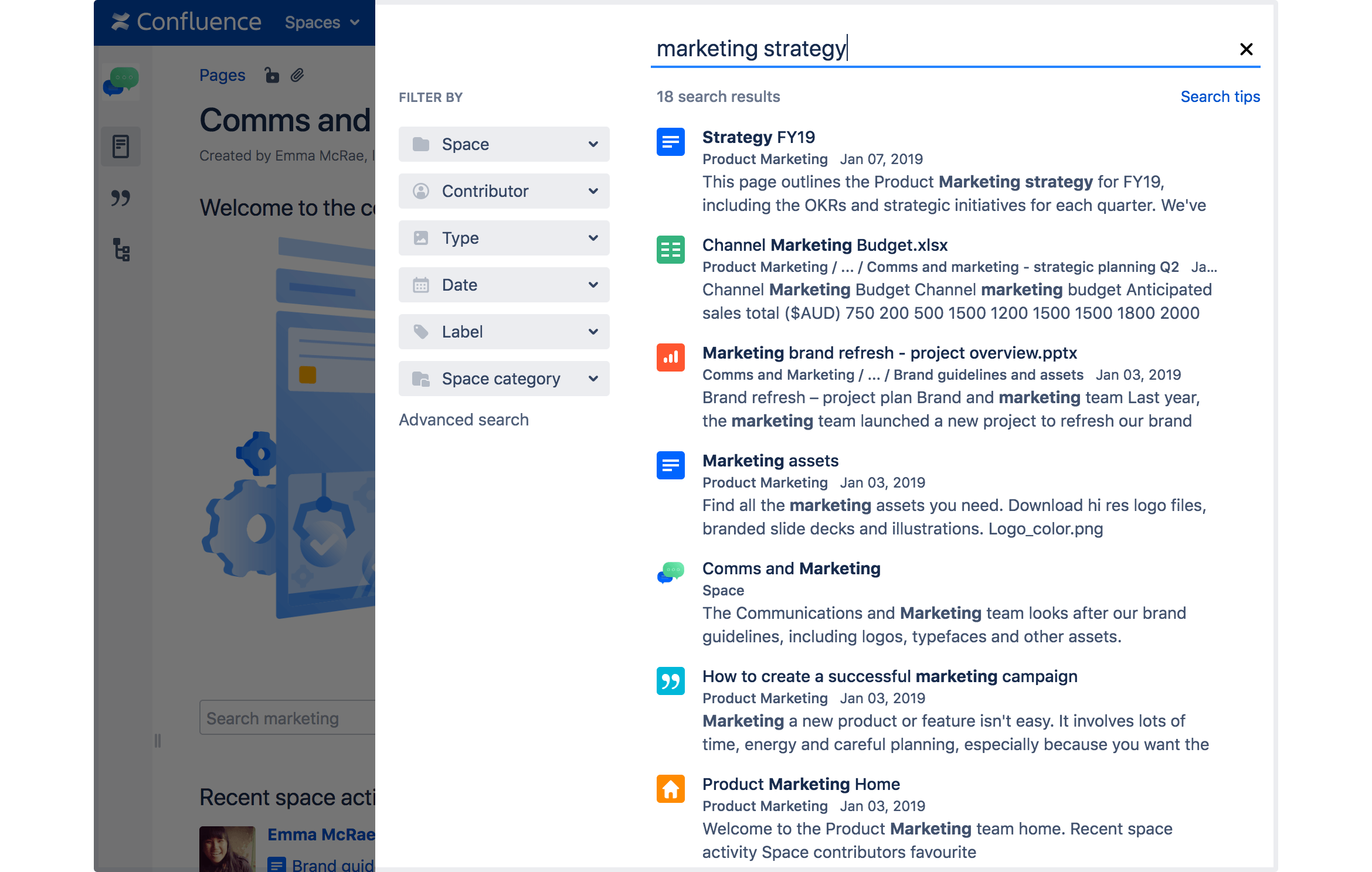 Поиск в Confluence Cloud обеспечивает лучшие результаты, релевантность и удобство использования, благодаря чему пользователям проще найти то, что им нужно.