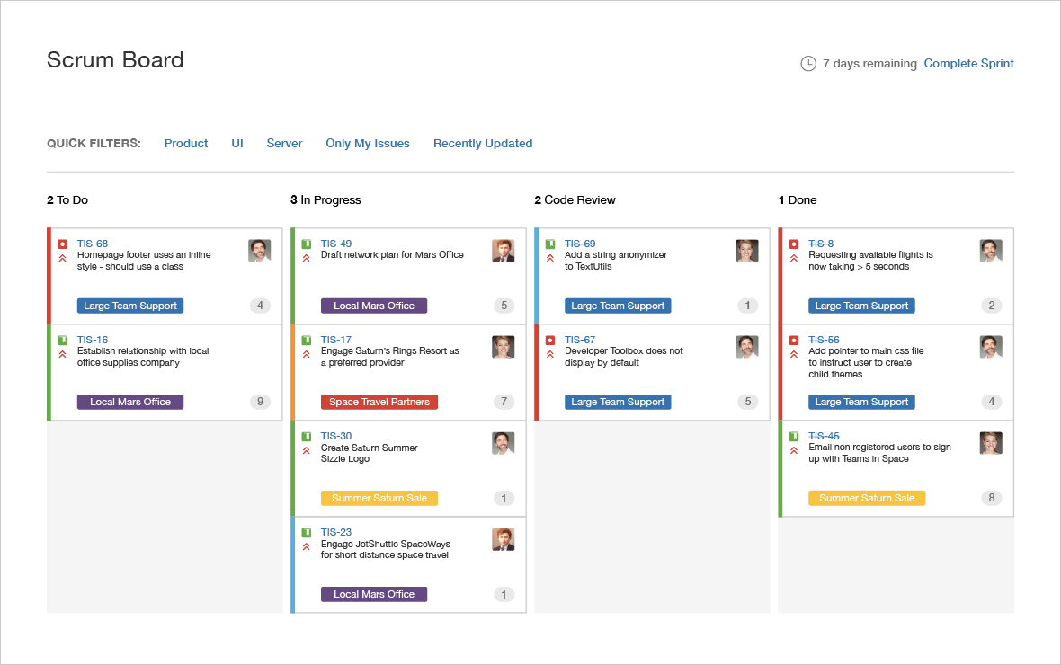 Scrum boards are used to visualize all the work in a given sprint. JIRA Software's scrum boards can be customized to fit your team's unique workflow. You can also easily add things like swimlanes to separate epics, assignees, projects, and more. At the end of the sprint, get a quick snapshot of all the issues that were completed and any unfinished issues will automatically move into the backlog to be addressed in the next sprint planning meeting.