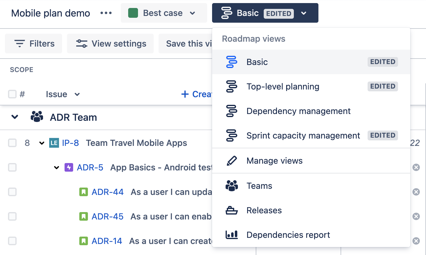 For a specific snapshot of your plan, you can create a new view. This is particularly useful for large, cross-functional projects, where concerns and needs vary across different stakeholders. Filters and view settings allow you to emphasize different aspects of your plan, which can then be saved and easily accessed at any time. For example, you can create a view that only shows certain work item levels or a single team’s work.