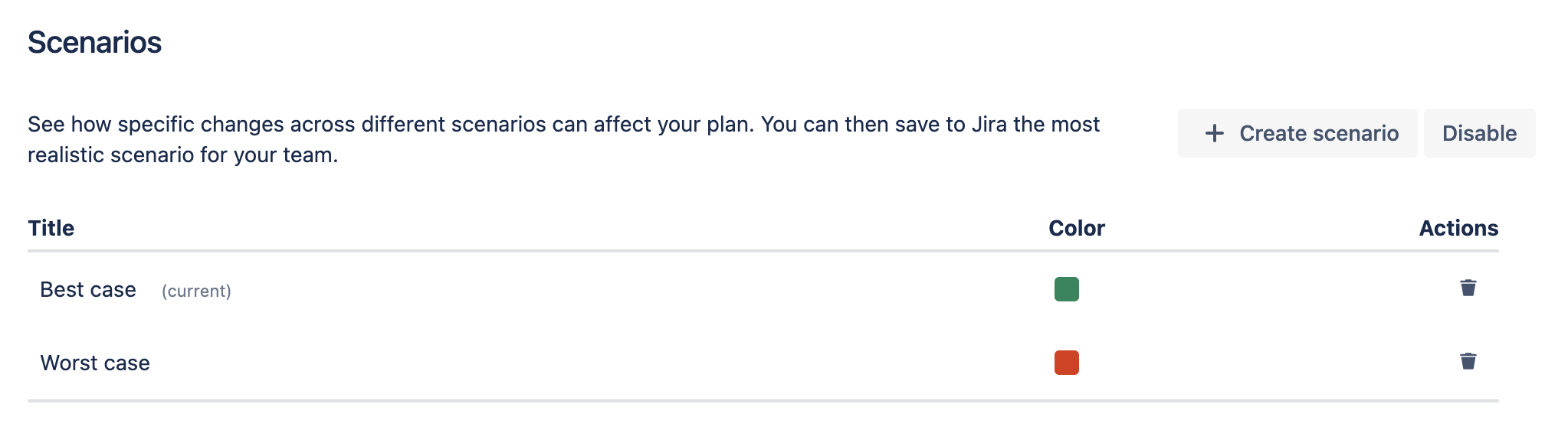 Since Plans functions as a sandbox environment for Jira data, you can enable scenarios to explore alternative paths to milestones or project completion. Planning different scenarios allows you to adjust dates, resources, and other inputs with minimal disruption. You can aim for your best case, plan for your worst case, and be prepared for anything in between.