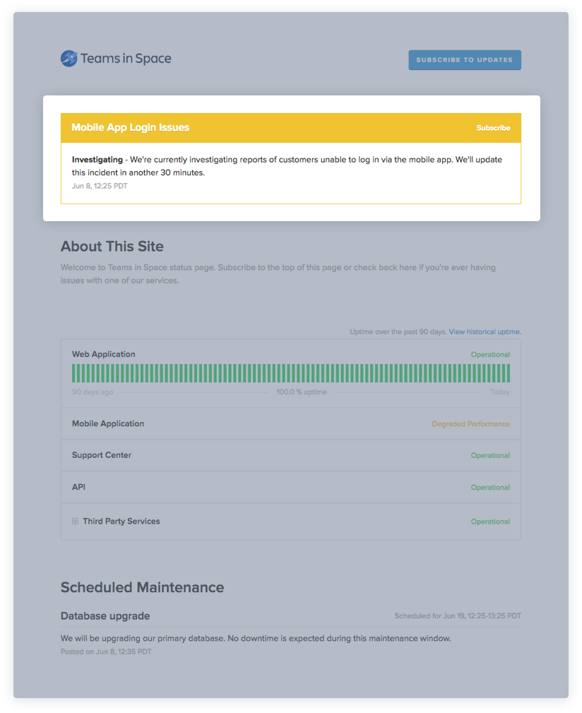 Ongoing incidents you create are displayed at the top of your status page as you and your team work through resolving.