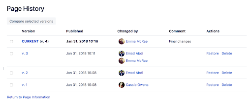 Confluence’s page history and page comparison views are great for getting tabs on all the changes in your project. Simply slide over to the specific page, click “More Options,” then view “Page history.” You’ll get a cavalcade of project management features: