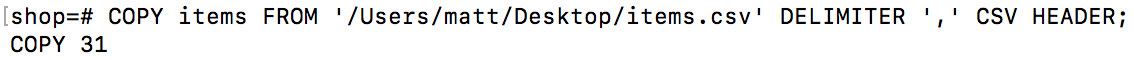 COPY items FROM ‘/Users/matt/Desktop/items.csv’ DELIMITER ‘,’ CSV HEADER;